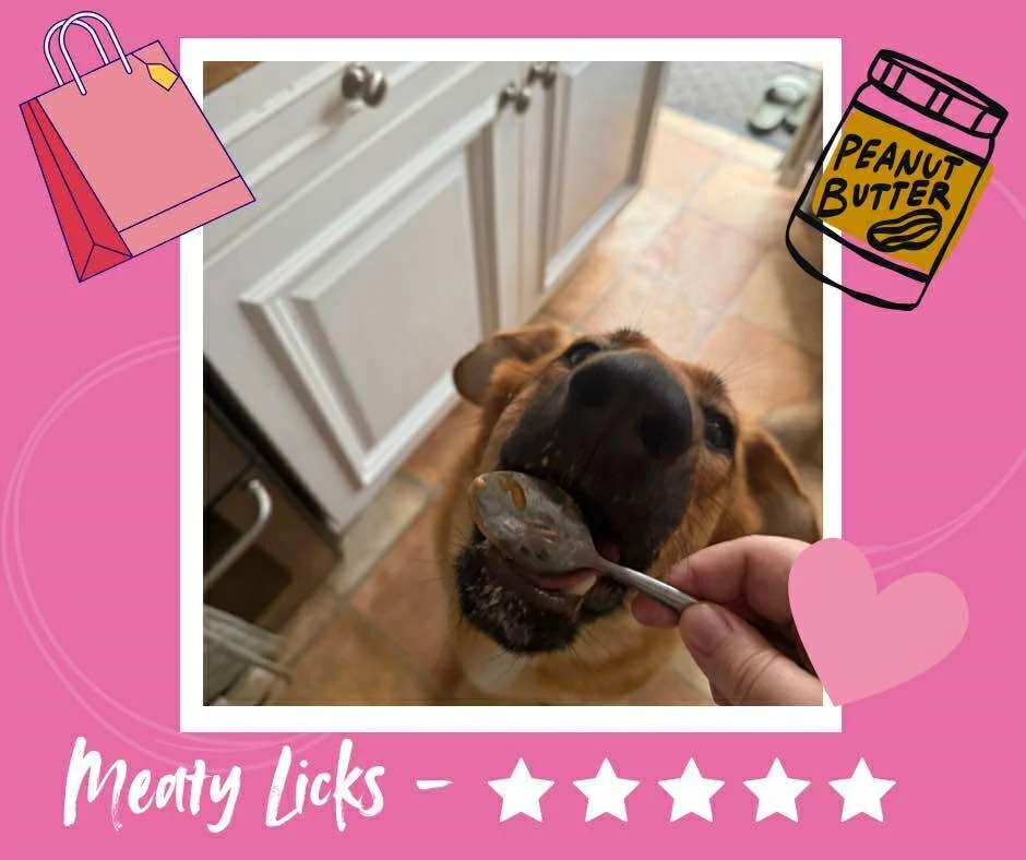 ★★★★/★★★★★ Is what one of our volunteers pups, Bubbles, would rate the new shops meaty licks. From ignoring a brand new dog toy, to trying to steal it out of her moms hand (still in the pouch) She can’t seem to get enough of them.