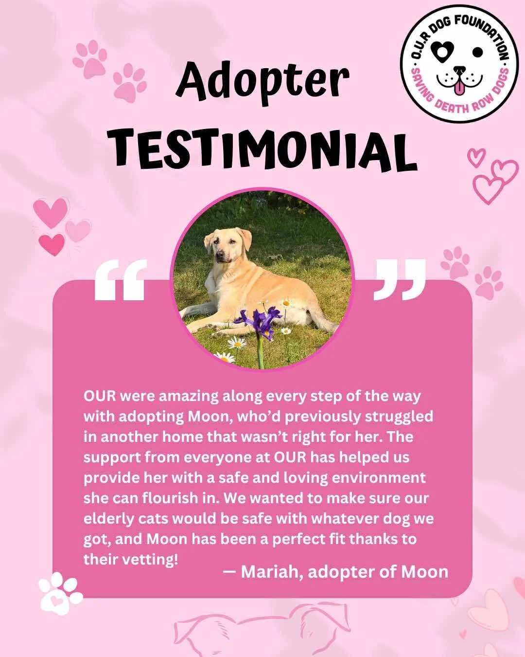 “OUR were amazing along every step of the way with adopting Moon, who’d previously struggled in another home that wasn’t right for her. The support from everyone at OUR has helped us provide her with a safe and loving environment she can flourish in. We wanted to make sure our elderly cats would be safe with whatever dog we got, and Moon has been a perfect fit thanks to their vetting. Her OUR foster family were amazing and helped set her on the right path making our lives much easier, and facilitated our adoption as well as it could have possibly gone, and I can’t imagine life without her!”