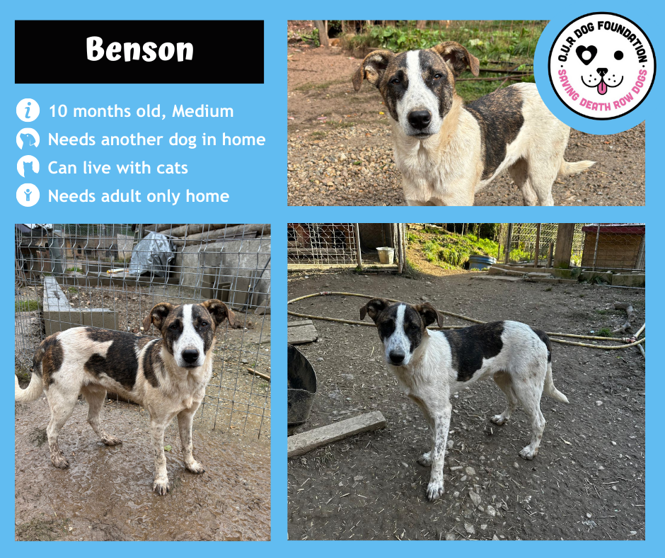 Because of his timid nature, Benson needs an adult-only home with experience and understanding. A calm environment will help him gain confidence, and a young, friendly resident dog is essential β he looks to canine companions for guidance, play, and comfort.