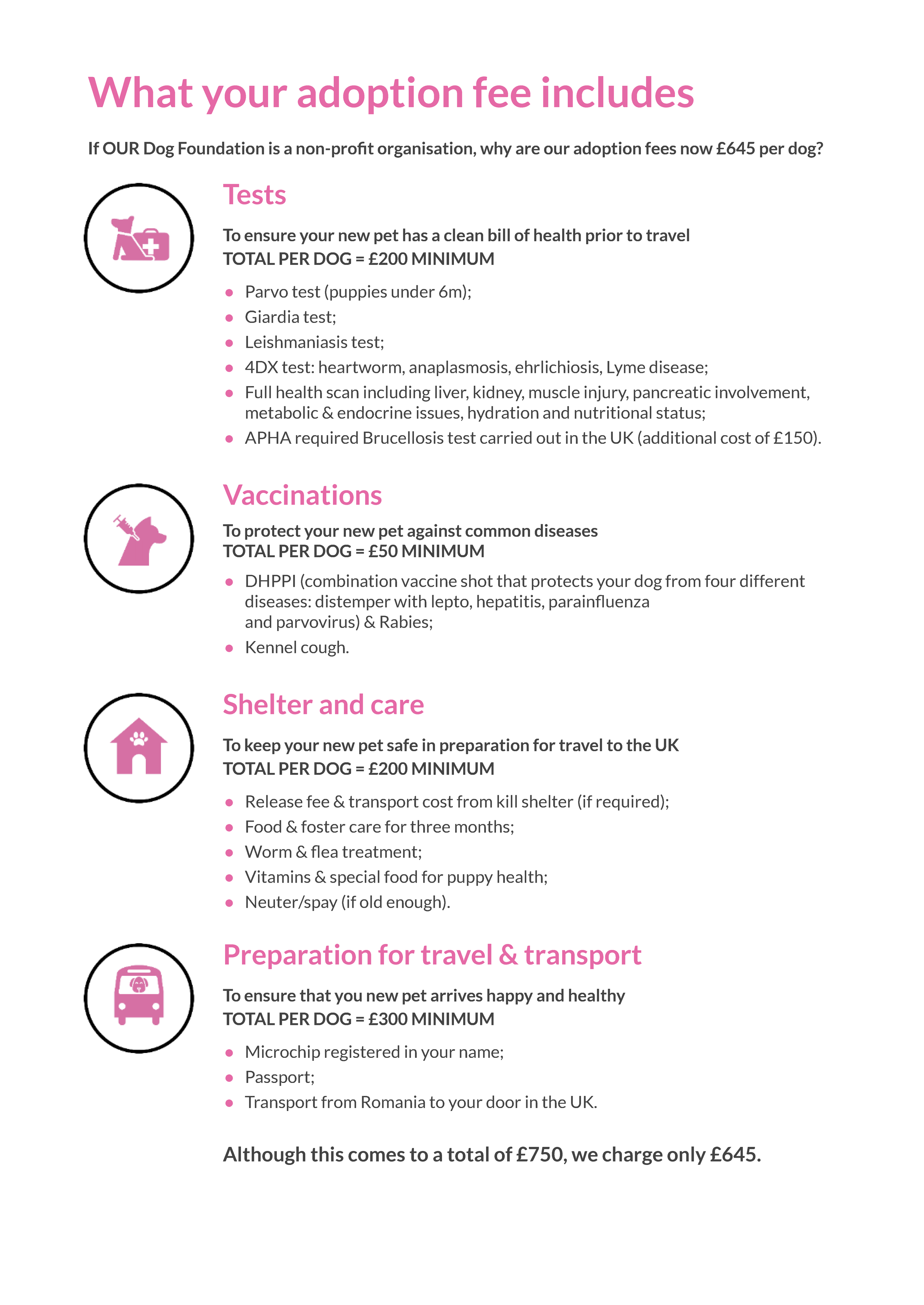 If your application and home check is successful, we will ask for a futher deposit of £100 to secure transport, with the remaining £395 of yor adoption fee due 1 week before travel, in full or via a 3 month payment plan.